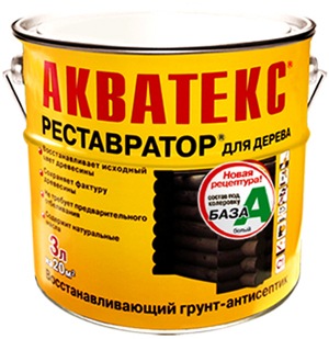 Акватекс Реставратор полностью закрашивает черноту древесины, но текстура дерева видна. Благодаря колеровке, можно окрасить древесину в любой цвет. Он имеет антисептические свойства.